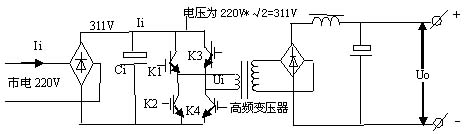 由電路可以看出,市電經整流濾波后變?yōu)?11V高壓,經K1~K4功率開關管有序工作后,變?yōu)槊}沖信號加至高頻變壓器的初級,脈沖的高度始終為311V。當K1,K4開通時,311V高壓電流經K1正向流入主變壓器初級,經K4流出,在變壓器初級形成一個正向脈沖,同理,當K2,K3開通時,311V高壓電流經K3反向流入主變壓器初級,經K2流出,在變壓器初級形成一個反向脈沖。這樣,在變壓器次級就形成一系列正反向脈沖,經整流濾波后形成直流電壓。當輸出電壓Uo較高時,脈沖寬度就寬,當輸出電壓Uo較低時,脈沖寬度就窄,因此開關管實際上是一個控制脈沖寬窄的裝置。